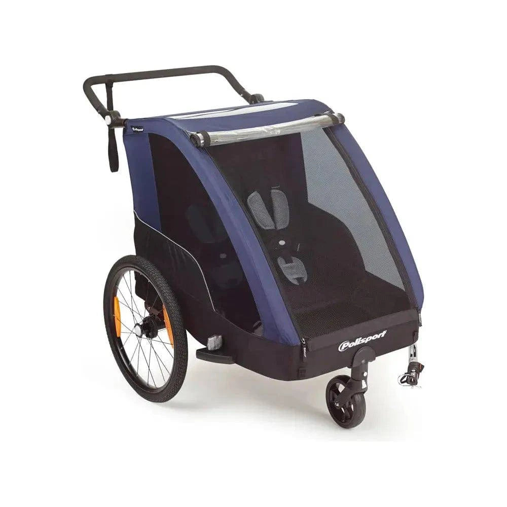 BE THE CHANGE. START MOVING. Nieuwe trailer voor fietsen en wandelen. Onze wereld verandert. De wereldwijde uitstoot van CO2 bereikt recordniveaus en lijkt niet te stoppen. Grote veranderingen kunnen we alleen samen maken en we moeten onszelf nieuwe gewoonten aanleren als we onze planeet willen beschermen. Duurzame vormen van vervoer en mobiliteit zijn slechts een stukje van de puzzel maar door het gebruik van groenere en duurzame opties zo makkelijk mogelijk te maken, kunnen we de dagelijkse routine veranderen. Met die gedachte introduceert Polisport een trailer in haar assortiment. "Fietsen is een duurzame vorm van vervoer dus dan moeten wij ook onze verantwoordelijkheid nemen en het gezin alle middelen aanbieden om vervoer per fiets een reële optie te maken", aldus Polisport. COMFORT: Zijn waterbestendigheid is een pluspunt op regenachtige dagen, samen met zijn eenvoudig te reinigen rubberen vloer . De Trailer heeft een aantal slimme binnenvakken, dus extra ruimte om mee te nemen wat je nodig hebt. Het opvouwbare ontwerp is ideaal voor opslag en de trailer is eenvoudig in- en uit te vouwen zonder gereedschap. De wielen verwijder je in een handomdraai dankzij het quick release systeem. De Trailer is voorzien van vering voor een soepele rit. VEILIGHEID 8 goed zichtbare reflectoren; Veiligheidsvlag; 5-Punts gordel; Parkeerrem; UV-bescherming op boven- en zijschermen; Voldoet aan EN 15918 en EN 1888 norme >b>KENMERKEN De Polisport Trailer is compatibel met 9 mm QR-achterwielen en massieve assen tot 10 mm, en heeft een aluminium en stalen frame en achtervering.