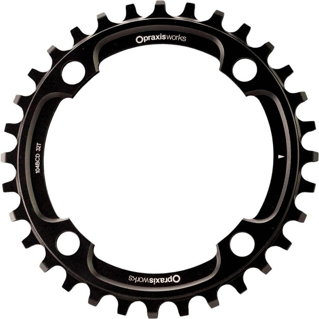 Praxis kettingblad 1x MTB 104BCD. Het single kettingblad beschikt over de WAVE technologie. Doordat de tanden om-en-om links en rechts uitgelijnd zijn zorgt dit voor een zijdelingse spanning op de ketting wat er voor zorgt dat de ketting op het voorblad blijft liggen. De kettingbladen zijn gemaakt van 7075-T6 Aluminium en verkrijgbaar in 30, 32, 34 en 36 tanden. 104BCD. Geschikt voor 10, 11 en 12 speed kettingen. De achter deraillleur dient een Clutch-type te zijn, Bijvoorbeeld Shimano Shadow of Sram Type 2. In ruw terrein, of voor de zekerheid, adviseren wij gebruik te maken van een kettinggeleider. LET OP: De 30 tands versie heeft M8 gaten, de benodigde bout moet minimaal 7.5mm draadlengte hebben.