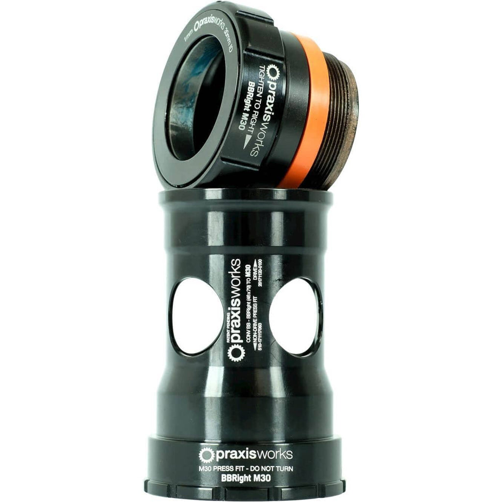 Praxis trapas M30 - BBRight Road. Geschikt voor Praxis M30 crank-as welke geïnstalleerd moet worden op een frame met BBRight aansluiting. Door de rubberen expander kan de BB nog strakker in het frame gefixeerd worden. Binnendiameter lager aandrijfzijde is 30mm, binnendiameter lager niet-aandrijfzijde is 28mm. Plaats de wave-washer aan de aandrijfzijde. Bevat cartridge kwaliteitslagers van het merk Enduro. Aluminium cups Let op: voor de installatie van dit BB dient een speciale Praxis BB tool gebruikt te worden.