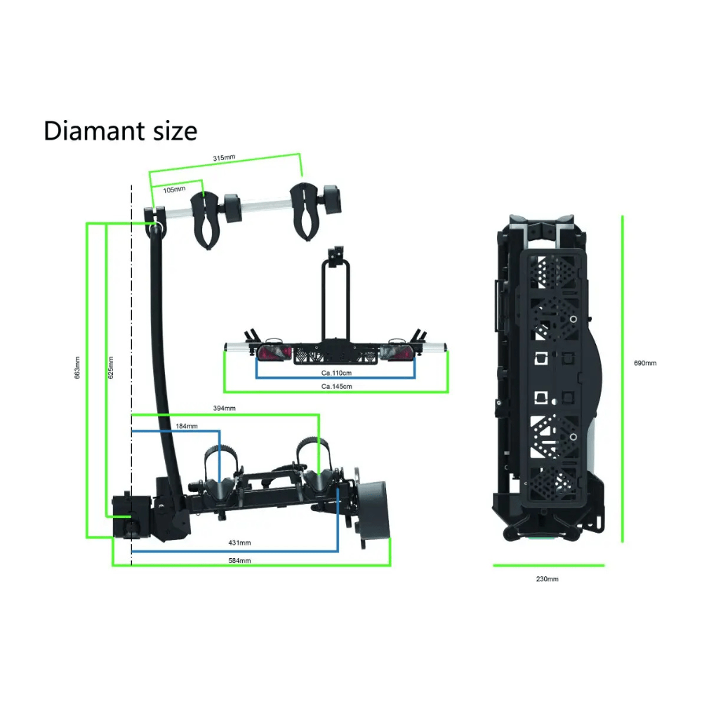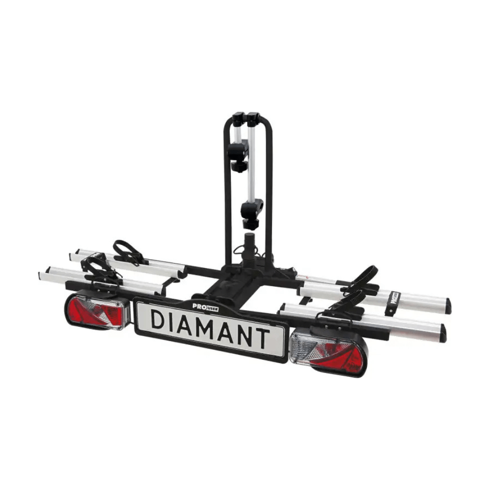De Pro-User Diamant is geschikt voor het vervoer van 2 (elektrische) fietsen! Dit komt mede door het handige inklapsysteem, de kantelfunctie en de eenvoudige montage op de trekhaak door een gepatenteerde, afsluitbare snelkoppeling. De verlichting werkt via een gecombineerde 7 of13-polige (Jaeger) stekker, inclusief mistachterlicht en achteruitrijverlichting (via 13-polige stekker). De fietsen staan in brede, stabiele aluminium wielgoten en worden bevestigd aan het frame zodat er geen belasting op het crankstel van de fiets komt te staan.