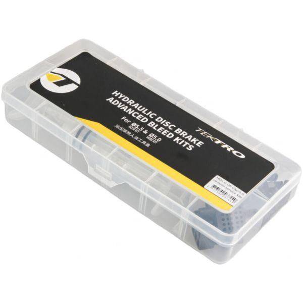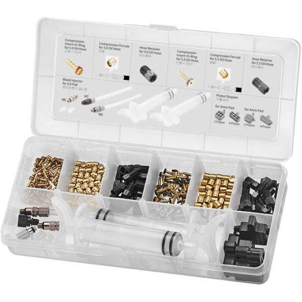 Een geavanceerde servicekit voor de fietsenmaker. Bevat alle onderdelen en gereedschappen die nodig zijn om TRP- en Tektro-remmen te onderhouden. Alleen het toevoegen van minerale olie is nodig.