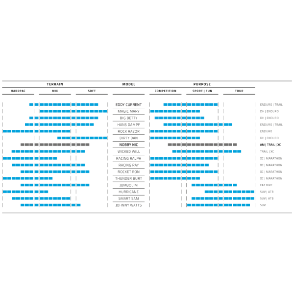 De Schwalbe Nobby Nic is een echte allrounder, die in iedere situatie functioneert ongeacht het weer of terrein. En dat met een in vergelijking gering gewicht! De Nobby Nic biedt het grootst mogelijke inzetbereik: voor Tour en All Mountain, voor de moeilijke Cross Country alsook voor de technisch veeleisende Enduro wedstrijden. De band is voorzien van een nieuw gereviseerd profieldesign met stabiele schoudernoppen voor meer tractie en een vergrote afstand tussen de noppen voor een hoog zelfreinigend vermogen. De speciale positionering van de centrale noppen verbeteren de aandrijving en remprestaties.