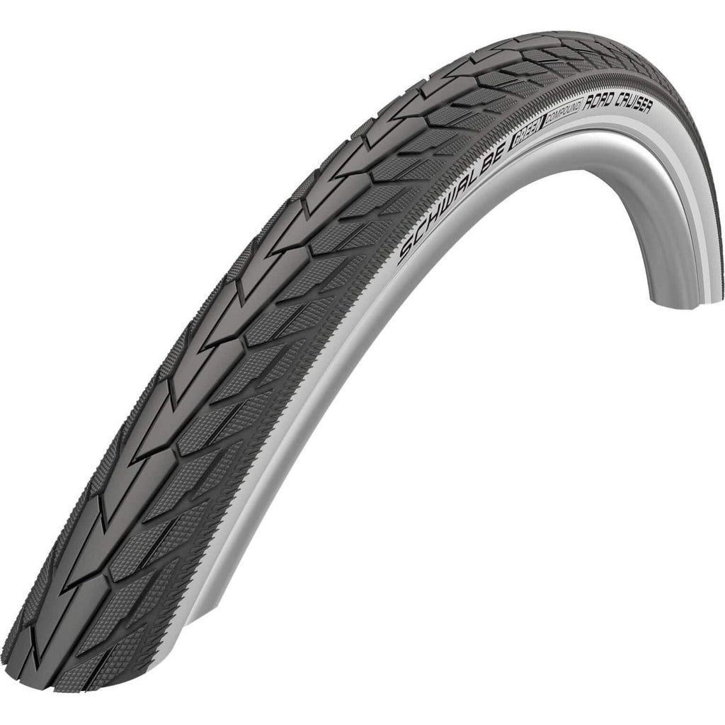 Schwalbe buitenband Road Cruiser Zwart/Wit R 28x1.60, 700x40C/42-622. Urban, individueel en dynamisch. De Road Cruiser maakt indruk met zijn aangename profieldesign en de ruime keuze aan kleuren voor fietsen van 12 inch tot 28 inch. Het meest opvallende kenmerk van de Road Cruiser zit op het loopvlak en heet Green Compound. Een rubber, gemaakt uit hernieuwbaar en gerecycled ruw materiaal, dat zo goed is dat het voor het eerst gebruikt kan worden in een conventionele band. Green Compound is uitsluitend in de zwarte versie verkrijgbaar.