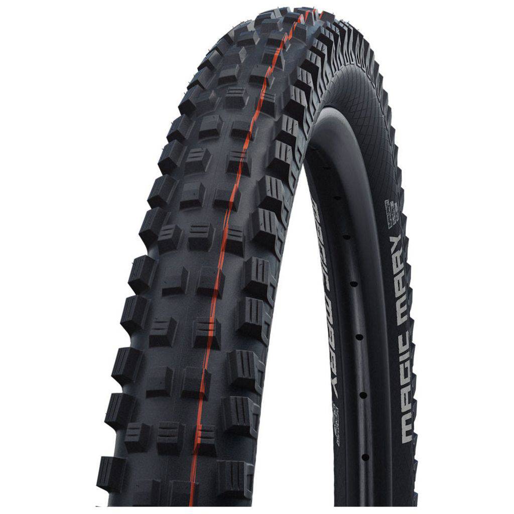 MAGIC MARY DE ULTIEME GRAVITY BAND. Onbetwist de favoriet van alle Schwalbe Downhill- en Enduro-atleten. Perfecte allround-eigenschappen voor bijna alle ondergronden en condities. Het geraffineerde intermediaite profiel wordt gecombineerd met de beste compounds en constructie en verlegt daarmee de grenzen tot ongekende hoogte. Sterke schoudernoppen en een agressief, open profieldesign zorgen voor maximale remtractie en grip in bochten, zelfs op hele modderige ondergronden. Met de voor Magic Mary ontwikkelde V-Groves, heeft iedere nop nog meer vertanding met de ondergrond, voor nog meer grip. Schuine vlakke noppen in het centrum van het loopvlak optimaliseren het rijgedrag. Productspecificaties: Grootte: ETRTO 62-584 (27.5 x 2.40 inch) Type: Vouwband Rubbermengsel: Addix Soft Uitvoering: Super Trail Kleur: Zwart Seal: TLE (tubeless easy) Gewicht: 1110 gram Bandenspanning: 3.50 bar (max. 50psi) Max. belasting: 115 kg EPI: 50 E-bike: E-50 Profiel: HS447 Binnenbanden: 21, 21A, 21AP, 21+AP, 21F