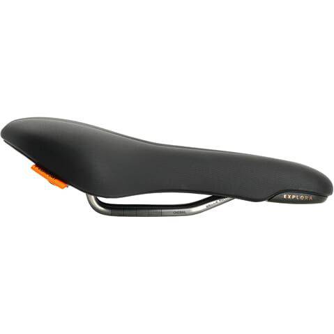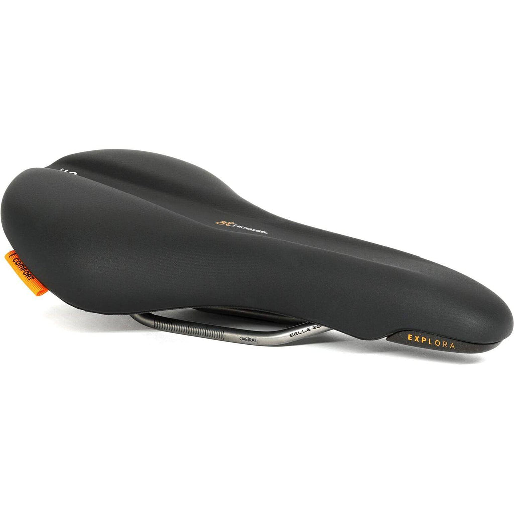 Selle Royal Explora Athletic zadel. Dit trekkingzadel is speciaal ontworpen om comfort te bieden in alle rijomstandigheden, zowel op het asfalt als op onverharde wegen. De inkeping in het zadel is ontworpen om de vorm van het lichaam ergonomisch te volgen, voor extra drukverlichting en ondersteuning. De niet-vervormbare mono-demper aan de achterkant van het zadel werkt als elastomeer en absorbeert zelfs de meest extreme en onverwachte schokken. Dankzij de geavanceerde RVL technologie van Selle Royal is dit zadel volledig waterafstotend. Met een zacht aanvoelende en elastische Durango cover en maximaal comfort dankzij de Royalgel vulling. Verkrijgbaar in een Atletic (fietshouding van 45 graden), Moderate (fietshouding van 60 graden) en Relaxed (fietshouding 90 graden) variant.