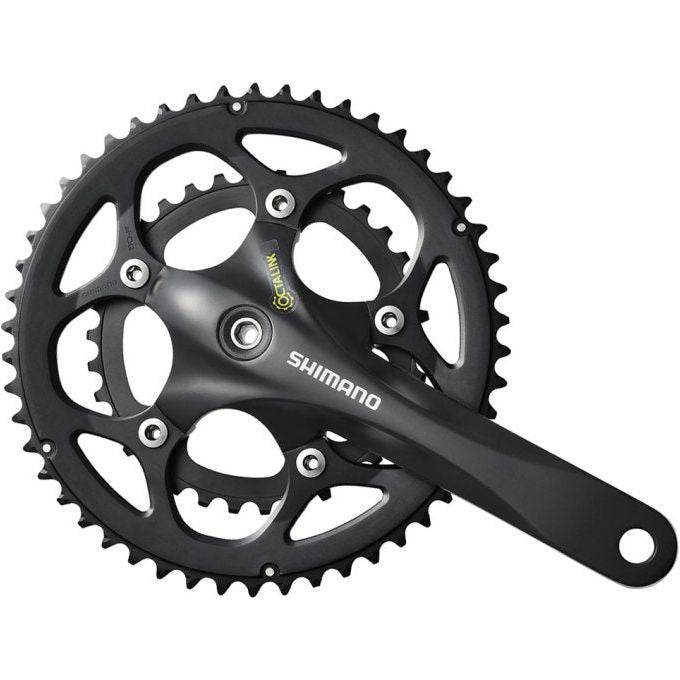 SHIMANO - OCTALINK- Race-crankstel - 2x9-versnellingen De SHIMANO FC-R345 Crank gebruikt een OCTALINK bottom bracket-interface en compacte met 50-34T compatibele kettingbladen met 2x9-versnellingen. HYPERDRIVE SG-X-kettingbladen Lichtgewicht en soepel schakelen voor rijcomfort voor de beginnende rijder Geschikte versnellingsverhouding 50-34T Trapas niet bijgeleverd (aanbevolen BB-ES300 octalink) Specificaties: Model: FC-RS345 Serie: Sora 3500 Serie Kleur: Zwart Breedte: BB-unit met schroefdraad: 70 mm BB-UN/ ES trapaslengte (mm), met schroefdraad (normaal): 113 Kettinglijn (mm): 43.5 Kettingbladcombinatie: 50-34T Compatibel BB-type: Octalink Compatibele ketting: HG 9-speed Inclusief montagebout crank Lengte crankarm (mm): 175 Armen kettingblad: 5 BCD (mm): 110 Versnellingen achter: 9 Aanbevolen BB met schroefdraad (normaal): BBES300 Q-factor (mm): 152,2