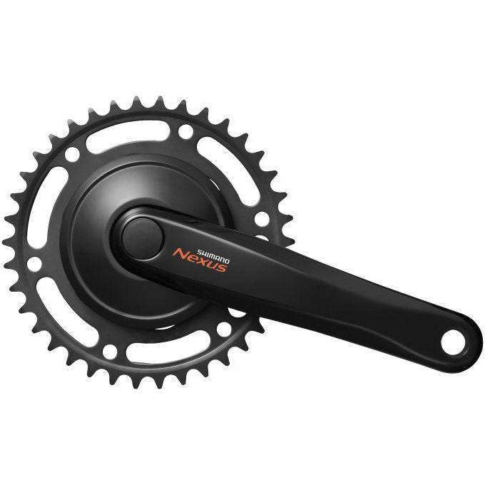 SHIMANO's NEXUS FC-C6000 crankstel gebruikt een bottom bracket-interface met rechthoekige versmalling. Productspecificaties Model: FC-C6000 Serie: NEXUS C6000 Serie Kleur: Zwart Compatibele ketting: HG 8-speed (1/2"X3/32") X (CN-HG71) Compatibele ketting: 1/2"X1/8" / X (CN-NX10) Geschikt voor kettingbeschermer Kettinglijn (mm): 44 Compatibel met vierkante trapas Inclusief montagebout crank Lengte crankarm (mm): 170 Aantal tanden: 38 Versnellingen achter: versnellingsnaaf Aanbevolen trapas met schroefdraad BB-UN300 Breedte trapas met schroefdraad: 68 mm