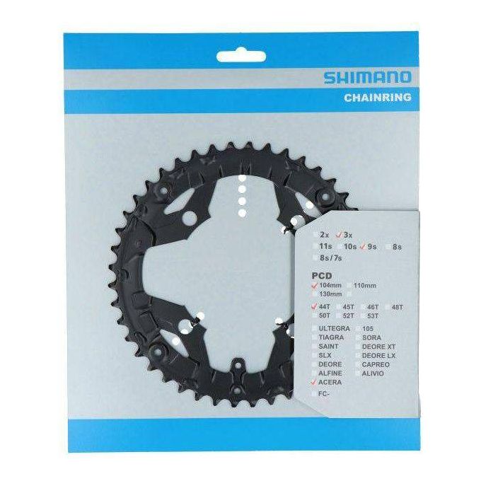 Product specificaties: Type voorblad: triple Kettingblad 44T Geschikt voor: FC-T3010 Serie: Acera Aantal tanden: 44 Snelheid: 9-speed Boutcirkeldiameter: 104 mm Materiaal: Staal