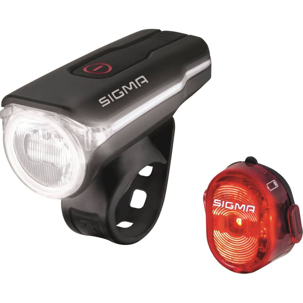 Sigma Verlichtingsset Aura 60 Lux USB LED, inclusief ge?©ntegreerde Li-ion accu met USB-oplaadfunctie + Nugget II achterlicht + Micro-USB-oplaadkabel. De top-koplamp van de Aura-serie straalt met de 60 Lux krachtige Osram Led-technologie. Met een verlichtingsafstand van 70 meter vormt het de ideale verlichting voor de sportieve fietser. FEATURES AURA 60: Lichtsterkte 60 Lux (30 Lux in Mid-modus, 18 Lux in Ecomodus), Verlichtingsbereik: 70 meter, Brandduur: 4h in Standaardmodus, 7h in Mid-modus, 10h in Ecomodus, Laadtijd: 3,5 uur, Klikschakelaar met voelbare aan/uit-indicatie, Spatwaterdicht volgens IPX 4, 360 ÷ verstelbare houder, Montage zonder gereedschap, Ge?©ntegreerde Micro-USB-oplaadfunctie, Tweetraps accu/laadindicator, Opladen tijdens gebruik mogelijk, Gewicht: 105 gram (inclusief houder), Zichtbaarheid van de zijkant, Osram Led. De nieuwe Nugget II Flash is klein, compact en USB-oplaadbaar. Hij is ontwikkeld voor dagelijks gebruik in het verkeer. De Nugget II garandeert een zeer hoge veiligheidsfactor door de krachtige 0,5 Watt Led en een rondom zichtbaarheid vanaf de zijkant. FEATURES NUGGET II: Led-achterlicht met ge?©ntegreerde Li-ion accu, 400 meter zicht, 3 Modi: Continu, High Power en knipperend, Branddtijd: 5h in Continu-, 2h in High Power- en 8h in knippermodus, Laadtijd: 2 uur, Montage zonder gereedschap met gummi-ring, Ge?©ntegreerde Micro-USB-oplaadfunctie, Zichtbaarheid van de zijkant, Tweetraps accu/laadindicator, Spatwaterdicht volgens IPX 4, Gewicht: 24 gram. Leveringsomvang Aura 60 USB / Nugget II Koplampset: Sigma Aura 60 USB koplamp, Nugget II achterlicht en Micro-USB-oplaadkabel.