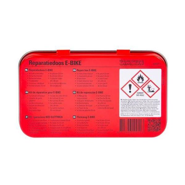 "In de unieke E-bike reparatiedoos van Simson zijn voorgevormde pleisters van hoge kwaliteit gevoegd, die in combinatie met de Simson-solutie zeer krachtig vulkaniseren met de binnenband. Hierdoor is de pleister één geworden met de binnenband, waardoor het lek op de sterkst mogelijke manier wordt gedicht. Om ervoor te zorgen dat u niet na de bandreparatie met vieze vingers het display van de E-bike gaat bedienen, is er een handschoenensetje bijgevoegd. De kunststof bandenlichters voorkomen beschadigingen aan de aluminiumvelgen die veelal op e-bikes worden gemonteerd. Met de handige schuur-/strijkpad kan met de ene zijde de band worden opgeschuurd en met de andere zijde de solutie worden uitgesmeerd.E-bikes worden veel voor lange ritten en verre afstanden gebruikt en tijdens het toeren is de bewoonde wereld niet altijd even dichtbij. Daarom heeft Simson een handige lekzoeker in de reparatiedoos gevoegd. Met behulp van de lekzoeker, kan het lek zonder hulp van bijvoorbeeld een emmer water alsnog makkelijk gevonden worden. Dit alles wordt nader toegelicht in de bijgeleverde instructies en de montagevideo op de website.