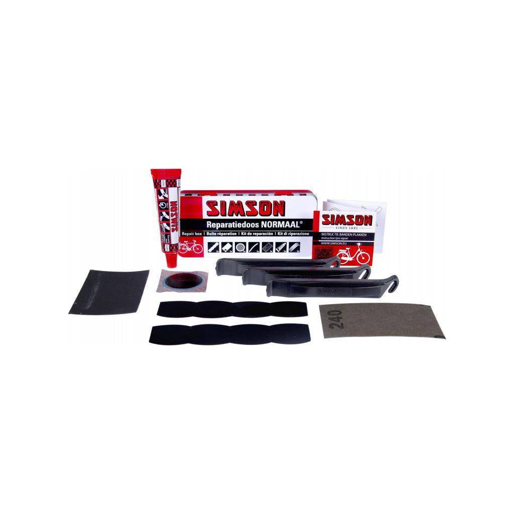 De enige echte originele Simson Reparatiedoos Normaal. Deze reparatiedoos is handig voor het repareren van vrijwel iedere traditionele fietsband zowel thuis als onderweg. Volg bij het plakken van de band de bijgeleverde instructies. De inhoud van de Simson Reparatiedoos Normaal is goed voor 12 plakbeurten en bestaat uit: 2 x vierstrip pleister, 1 x knippleister, 1 x waterproof schuurpapier, 1 x buitenbandplakker 35 mm, 1 x ventielslang, 1 x tube solutie 10 ml, 3 x bandenlichter. De meegeleverde bandenlichters zijn van kunststof (voorheen waren deze van metaal).