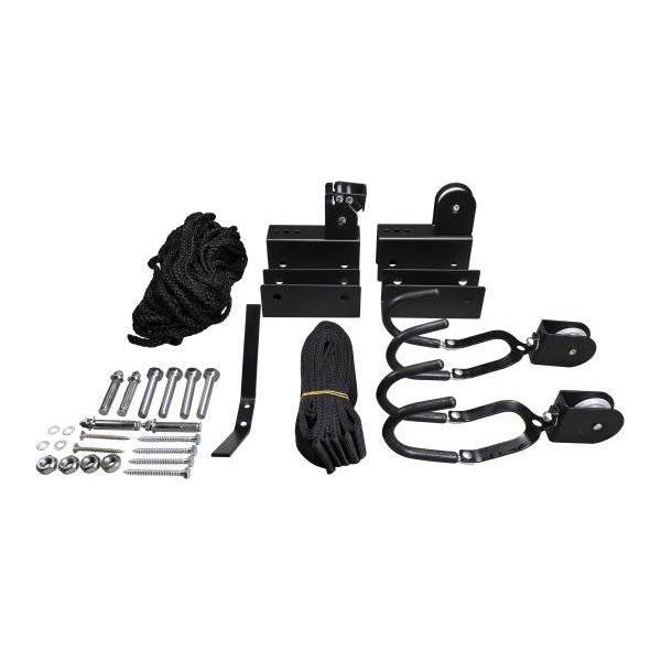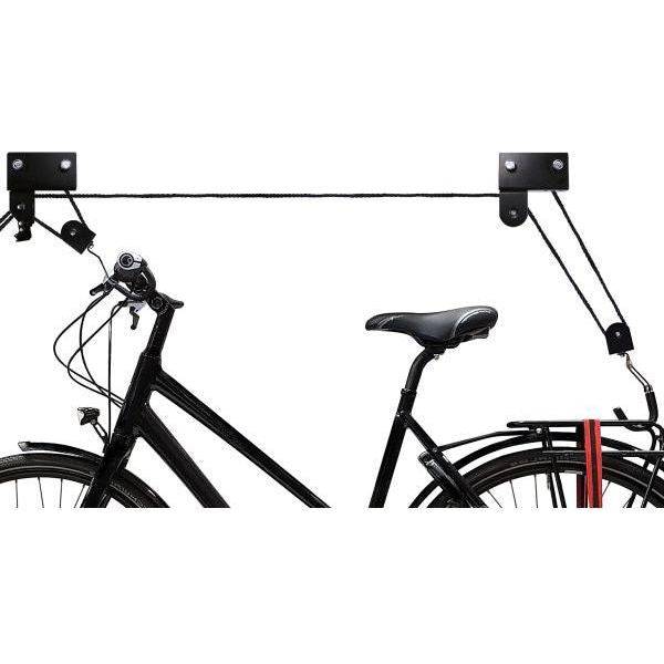 Met de extra sterke Simson (E)-bike lift en ophangsysteem kan je eenvoudig thuis een fietsreparatie uitvoeren of een (E)-bike opbergen. De fiets kan op verschillende hoogtes worden gehangen door middel van katrollen. De TÜV gekeurde Simson (E)-bike lift en ophangsysteem kan maximaal 54 kilo dragen en op 3 meter hoog worden gehangen. Let hierbij op dat het plafond waar de lift aan gemonteerd wordt dit ook kan dragen. Bij de Simson (E)-bike lift en ophangsysteem worden ook handige draagbanden meegeleverd. Hiermee kan bijvoorbeeld een dakkoffer of surfplank snel en makkelijk worden opgeborgen.