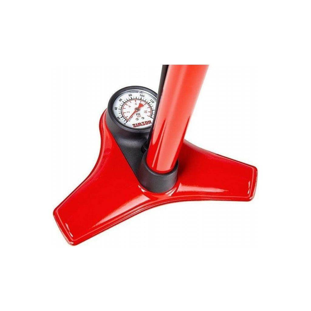 De Simson hogedrukpomp ‘Excellent’ heeft een modern ontwerp eneen pompbereik van 9 bar / 130 PSI. De bandenspanning kan snel en makkelijk worden afgelezen van de geïntegreerde manometer. Dit maakt de pomp onder andere zeer geschikt voor E-bikes, racefietsen, ATB’s en pedelecs. Door de stalen pompbuis en stalen pompvoet is de ‘Excellent’ een zeer sterke hogedrukpomp. Het ergonomische kunststof handvat zorgt voor een comfortabele greep bij het pompen. De rode fietspomp is voorzien van een dubbele pompkop waarmee alle soorten fietsventielen zonder hulp van verloopstukken eenvoudig kunnen worden opgepompt.