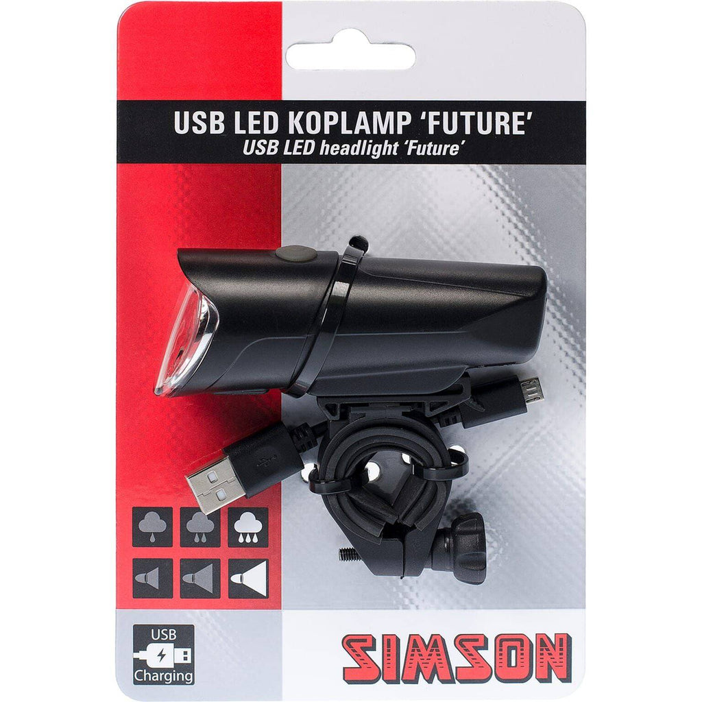 De Simson USB Koplamp ??Future?? is een krachtige oplaadbare koplamp met een kunststof behuizing en stuurhouder. De lamp is eenvoudig op te laden via de USB poort van de computer. De LED geeft een zeer sterke lichtbundel met een opbrengst van 30 LUX. Deze koplamp heeft een makkelijk te bedienen drukknop met aan, dimmen, uit en knipper functie.