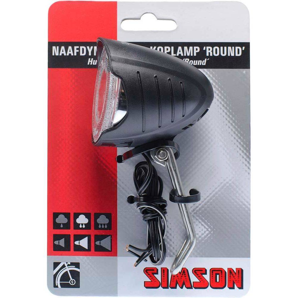 De Simson Naafdynamo LED koplamp Round is een klassieke koplamp in een kunststof uitvoering. De Koplamp met ge?©ntegreerde reflector heeft een lichtopbrengst van 7 LUX en een makkelijk bedienbare aan/uit knop. De koplamp is geschikt voor voorvork montage en is eenvoudig te bevestigen op het kroonstuk van de voorvork. Sluit vervolgens de lamp met het meegeleverde verlichtingssnoer aan op de (naaf)dynamo. Ook het achterlicht kan op deze koplamp worden aangesloten op de aansluitpolen.