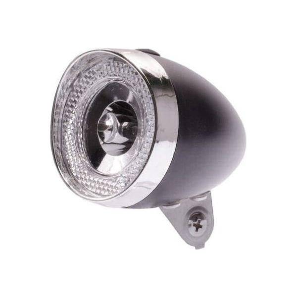 Uitgebreide productinformatie: De Simson Batterij Voorvork koplamp ''Classic Mini'' is speciaal ontworpen voor kinder-, stads- en urban fietsen. De lamp is onderdeel van de Simson Premium Lijn, welke bestaat uit zeer hoogwaardige kwaliteitsproducten. De koplamp heeft een klassieke behuizing van slagvast ABS met een aan- en uitschakelaar op de bovenzijde. De metalen delen zijn gemaakt van roestvrijstaal en de lamp is 100% spat- en regenwaterdicht voor een optimale levensduur. De krachtige witte LED geeft een heldere lichtuitstraling. De koplamp is geschikt voor montage op het balhoofd, of onder de voordrager aan de voorzijde van de fiets. Inclusief batterijen: 2 x AAA. Productspecificaties: Klassieke behuizing 100% spat en regenwater dicht Geschikt voor voordragers