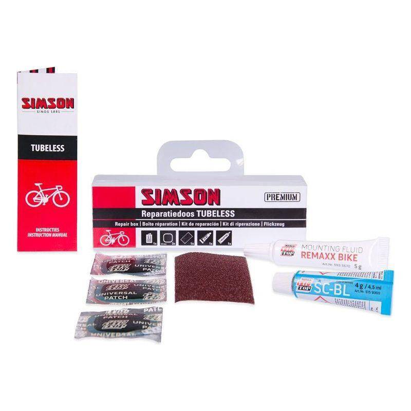 Met de Simson Tubeless-reparatieset repareer je gemakkelijk een gat of punctie in je tubeless-band. Door de speciale blauwe solutie vulkaniseert de zeer sterke pleister gemakkelijk met de buitenband. De speciaal versterkte bandenpleisters zorgen voor een permanente reparatie van de band en voorkomen het verder scheuren en beschadigen van de band. De set wordt geleverd met een tube Remaxx-montagevloeistof. Door de hiel van de band in te smeren met deze vloeistof kun je de band makkelijk monteren. De vloeistof verdwijnt vanzelf en laat geen resten achter.