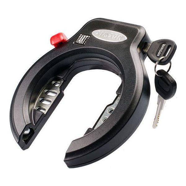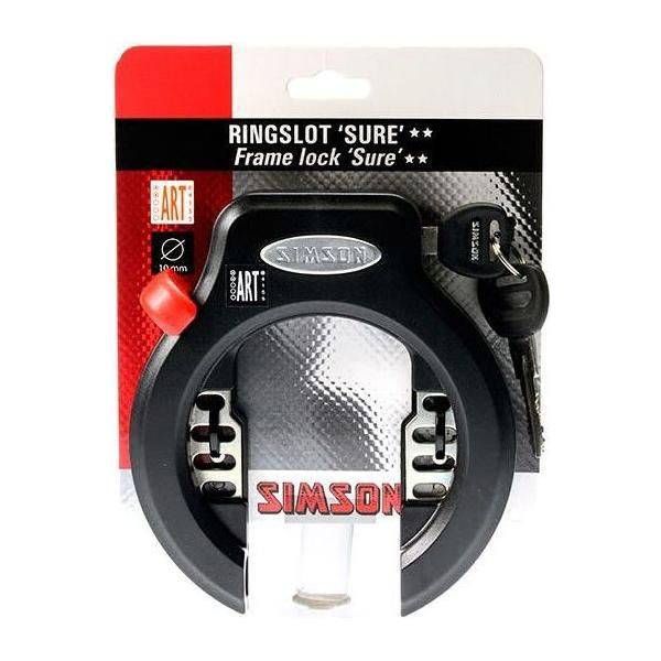 Het Simson Ringslot Sure is zeer sterk en toepasbaar op vrijwel ieder frame. Het slot is ART2 gekeurd en daardoor voor bijna iedere fietsverzekering te gebruiken als goedgekeurd slot. Het ringslot kan gemonteerd worden op de framebuis met de Simson Ringslot Montageset, maar het slot is ook geschikt voor topbout montage. Het slot wordt geleverd met twee sleutels.