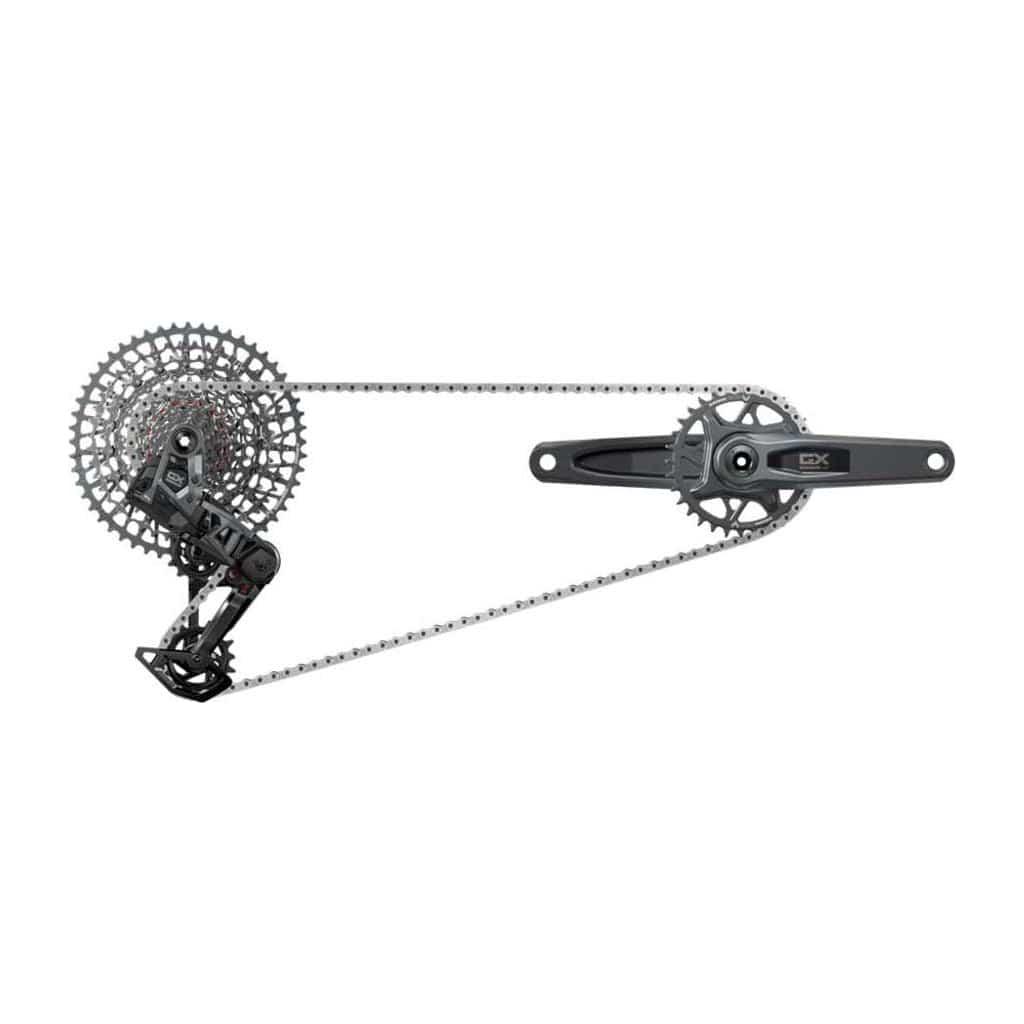 De SRAM GX Eagle T AXS MTB-groepset garandeert maximale stijfheid, krachtoverbrenging en duurzaamheid. Schakelen onder belasting is mogelijk gemaakt op de GX-cassette dankzij een combinatie van de X-SYNC-technologie en een geoptimaliseerde schakelhulp op de cassette. De direct mount Sram GX Eagle (T-type) achterderailleur zorgt voor een directe vermogensoverdracht, zelfs tijdens het schakelen. Daarnaast bestaat deze uit los vervangbare onderdelen voor een hoge duurzaamheid. De sterke ketting zorgt voor soepel schakelen onder alle omstandigheden, aangevoerd door de AXS Pod control shifter die volledig naar eigen wens instelbaar is.