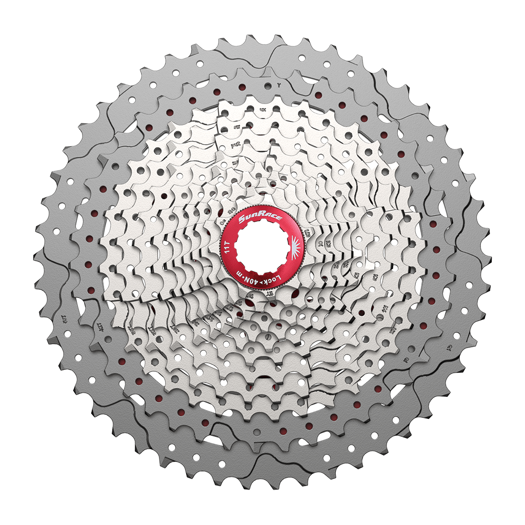 Merk: Sunrace Model: CSMX80 Number of speeds: 11 speed (wide ratio) Verzet: 11-51T (11-13-15-18-21-24-28-32-36-42-51) Lichtgewicht ontwerp Fluid Drive Plus Gewicht -512 gram Materiaal: A7075 grootste 2 tandwielen, aluminium spider, staal Kleur: zilver