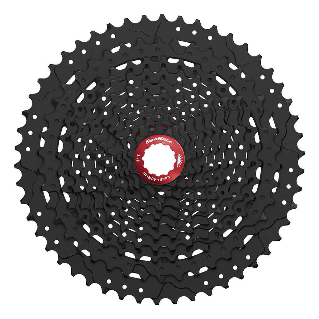 Merk: Sunrace Model: CSMX80 Number of speeds: 11 speed (wide ratio) Verzet: 11-51T (11-13-15-18-21-24-28-32-36-42-51) Lichtgewicht ontwerp Fluid Drive Plus Gewicht -512 gram Materiaal: A7075 grootste 2 tandwielen, aluminium spider, staal Kleur: zwart