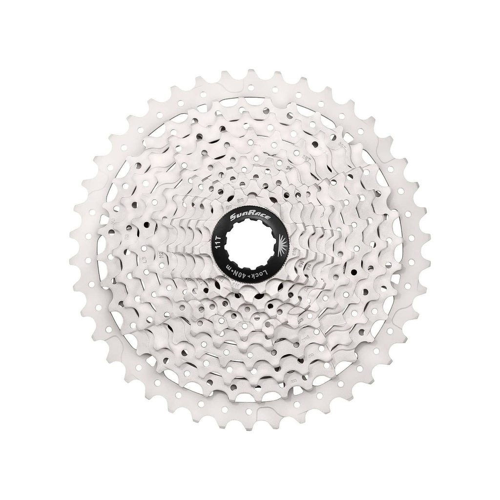 Model: CSMS3 TAY Versnellingen: 10 (wide ratio) Functie: Fluid Drive Plus Vertanding: 11-42T Tandcombinatie: 11-13-15-18-21-24-28-32-36-42 Materiaal: - Spider, spacer en sluitkrans: Aluminum - Tandkrans 1 t/m 9: Hi-Tensile Steel - 10e tandkrans: A7075 Aluminum / Anodized Afwerking: Metallic Silver Gewicht: 387 gram