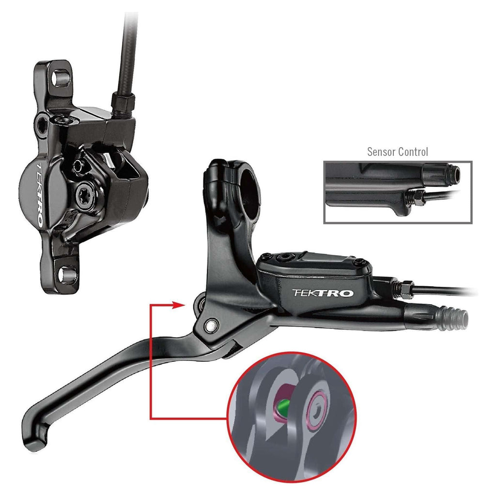 Hydraulische schijfrem Tektro HD-E350 links met remsensor voor E-bike. Open systeem Ontwerp van sensorbesturing Grote ruimte tussen de remblokken Eenvoudige installatie, aanpassing en onderhoud. Remschijf Wave-type (TR160-24) Hoge warmteverspreiding en hittetolerantie Doorsnede: Ø160 mm Gewicht: 129 gram Ook verkrijgbaar: Ø180mm / Ø203mm Hendel Gegoten aluminium hendel en beugel Bereik aanpassing Houderklem uit twee onderdelen 3 vingerige greep Geïntegreerde claxonschakelaar Afwerking: zwart Remklauw Gesmeed aluminium huis Eenvoudig te vervangen pads van bovenaf Afwerking: zwart Remblokken Metaalkeramische samenstelling Gewicht Gewicht voorrem - 302 gram / achterrem - 322 gram (Exclusief rotor, adapter en montagebouten)