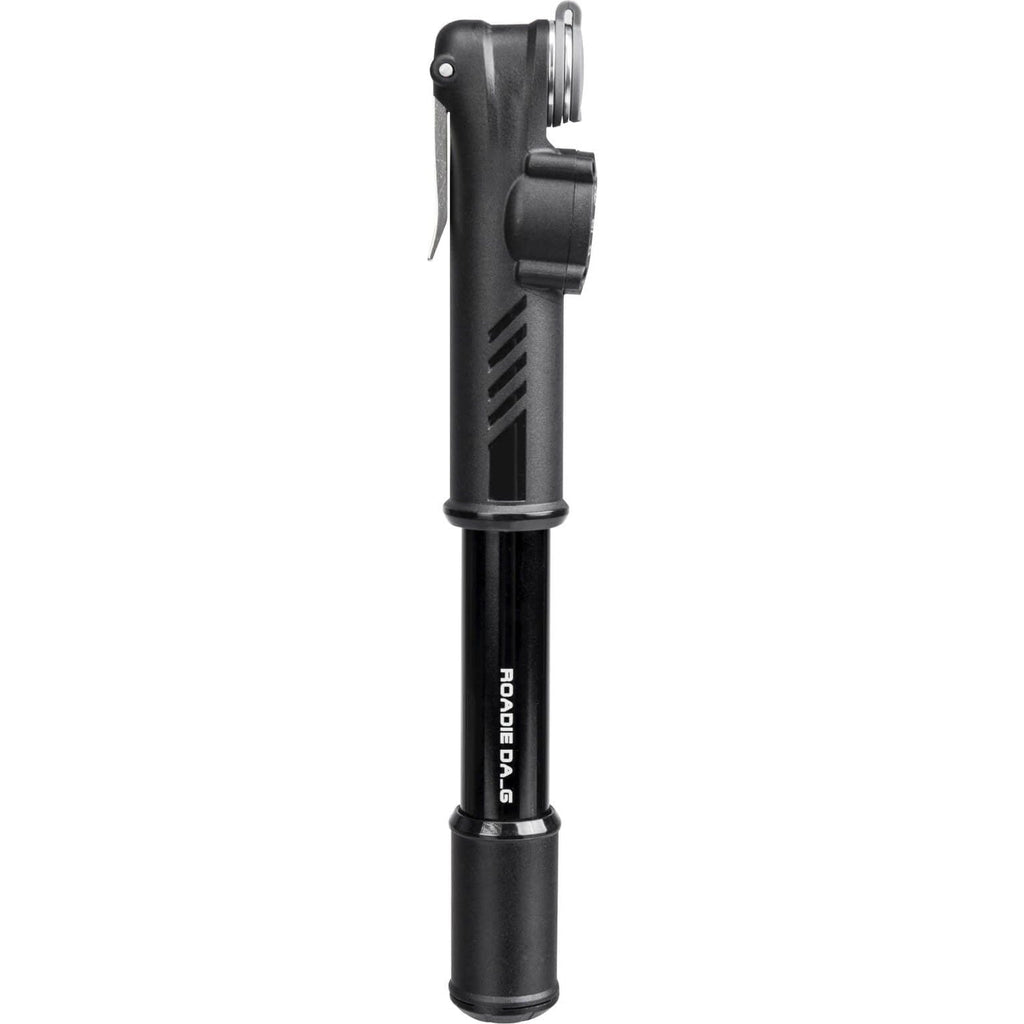 Topeak Minipomp Roadie DA_G. De meest compacte en lichtgewicht versie in de DA-pompserie past gemakkelijk in de zak van fietskleding. Dual-Action (DA) verdubbelt volume bij elke slag en blaast de banden op tot 120 psi 8 bar. Geintegreerde stofdop houdt de pompkop schoon en duimvergrendeling hendel verzekert een luchtdichte afdichting. 116 gram. TRDA-1G