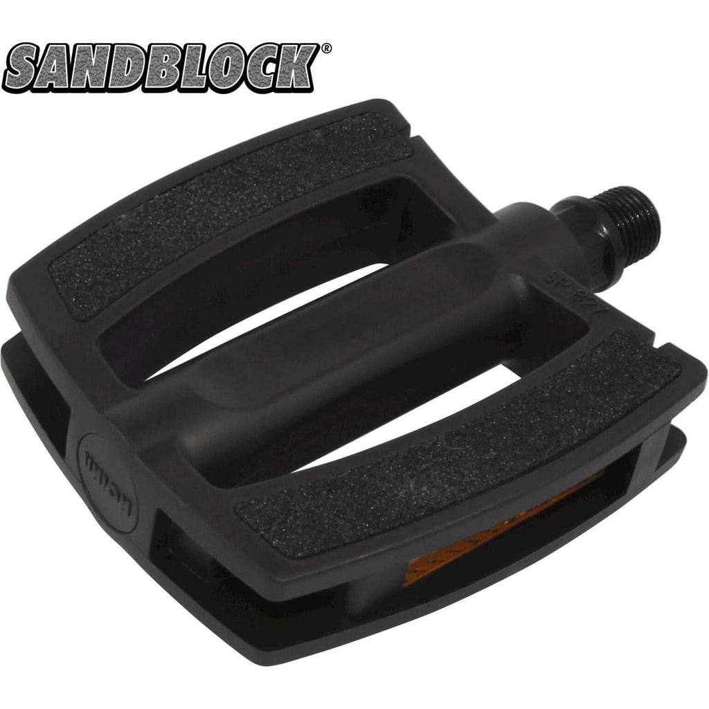 Union pedalen SP-827 SANDBLOCK zwart. 1-delig pedaal. 2-K pedaal. Een zwart polypropyleen ashuis en kooi (uit 1 stuk) en een extra grote non-slip inzet gemaakt van zwart SANDBLOCK. Voorzien van een ED black boron stalen as 9/16, 3/32 kogellager (LBS) en goedgekeurde reflector. Uitermate geschikt voor E-Bikes