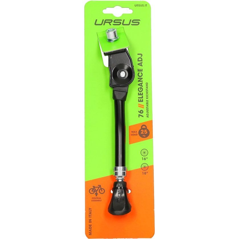 Geschikt voor 18" en 20" fietsen Verstelbaar d.m.v. draaien aan het stalen deel Voor bevestiging aan montageplaat achter de trapas Afmeting montageplaat: 55 x 29 mm Met veiligheidsvoet Incl. inbusbout M8 x 20 mm Gewicht: 204 gram Kleur: zwart