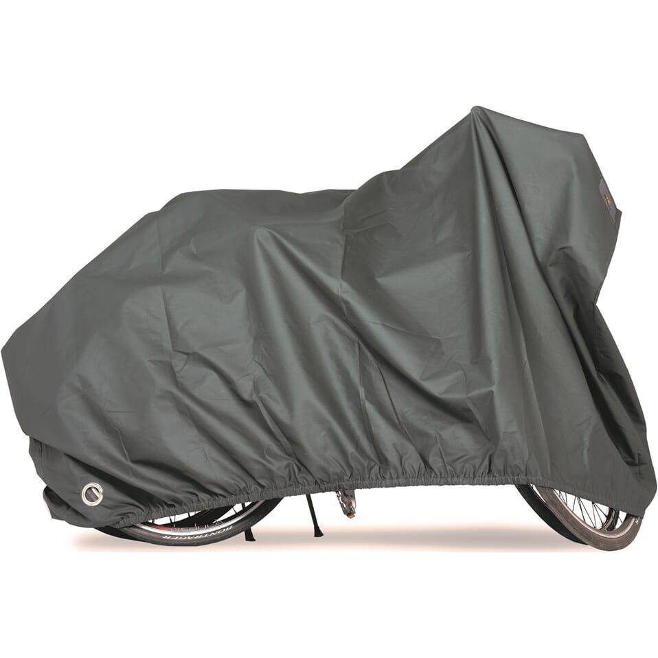VK Fietsbeschermhoes Re-cover Duo 130x250 forest green, uitgevoerd met grote ringen voor een kabelslot, en gemaakt van gecertificeerd gerecycled polyester.